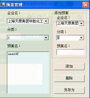 3 预案管理:该功能用于对各企业的预案进行管理,当发生事故时可根据各单位的各个分类快速便捷地查询预案。在功能窗口中,选择企业名和该企业的分类名,下方列表中显示与其相关联的预案,双击预案名即可打开查看该预案。右边的添加预案功能中,选择企业名并设置分类,选择“添加”按钮,便可将选中的预案添加到数据库,供下次调用查看。